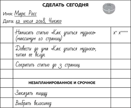 Пример, который прояснит динамику обращения с внутренними отвлекающими факторами. Во время второй Помидорки при написании статьи «Как учиться музыке» Марк внезапно почувствовал, что должен позвонить своей подруге Кэрол и узнать, когда их любимая рок-группа дает следующий концерт. Марк спрашивает себя: «Это действительно срочно? Мне обязательно нужно сделать это сегодня? Нет, я могу это отложить. Может быть, на час или два. А может быть, и вовсе на завтра». Марк ставит апостроф в «Списке дел на сегодня» напротив текущей работы (рисунок 10), добавляет пункт в «Полную перепись дел» как незапланированный (метка Н – рисунок 11) и продолжает работать в рамках текущей Помидорки.