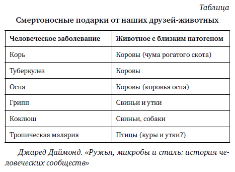 «Вирус кори, например, наиболее родствен вирусу, вызывающему чуму рогатого скота. Эта опасная эпидемическая болезнь поражает коров и многих других жвачных млекопитающих, но не людей. Корь, в свою очередь, не трогает рогатый скот. Близкое сходство вируса кори и вируса коровьей чумы указывает на то, что последний, скорее всего, перешел от скота к людям и затем эволюционировал в вирус кори, адаптировав под нас свои свойства. В такой смене хозяина нет ничего удивительного, если учесть, что многие крестьяне живут вблизи коров, а значит, и их экскрементов, мочи, дыхания, язв и крови. Наш тесный контакт с рогатым скотом, который мы когда-то одомашнили, продолжается уже девять тысяч лет – вполне достаточное время для того, чтобы вирус коровьей чумы сумел до нас добраться. Как показывает следующая таблица, у других человеческих инфекционных заболеваний тоже можно отыскать предков среди болезней братьев наших меньших».