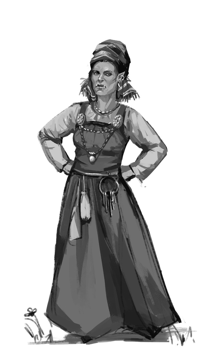 Клыки были, но поменьше. Уши … все-таки по аккуратнее, чем лопухи мужиков. Волосы убраны под затейливо повязанный платок, из-за чего тот больше походил на тюрбан. Зрачков я с такого расстояния не рассмотрел, но ждать чего-то иного было легкомысленно. А еще у нее были все необходимые женскому телу выпуклости – грудь и бедра отлично вырисовывались сквозь длинное, до земли, облегающее платье на широких бретелях. Но все равно, фигура: тяжелоатлетки приняли бы за свою. Как говорила одна моя подруга, занимавшаяся швейкой: «90-90-90, талию где будем делать?»