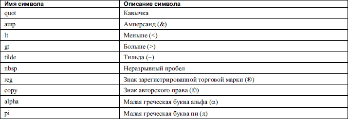 Как можно увидеть, ссылка на символ в тексте HTML-документа начинается символом & и заканчивается точкой с запятой (;). Особо стоит рассмотреть использование именованных ссылок на символы. Дело в том, что использование первых двух вариантов предполагает, что автору известны численные коды символов, которые он собирается добавить в документ. Однако согласитесь, что постоянно искать в таблицах численные коды нужных символов по меньшей мере неудобно. По этой причине в HTML предусмотрены имена для наиболее часто используемых символов. Эти имена и записываются вместо кода в тексте ссылок на символы. Имена некоторых часто используемых символов приведены в табл. 3.1. Полный список именованных ссылок на символы приведен в приложении 1.