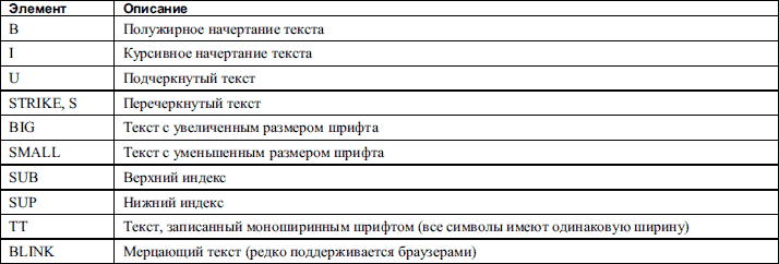 Задание начертания текста является, возможно, самым простым средством форматирования содержимого документа, которое доступно в HTML. Для изменения начертания текста в HTML-код добавляются элементы, приведенные в табл. 3.2.