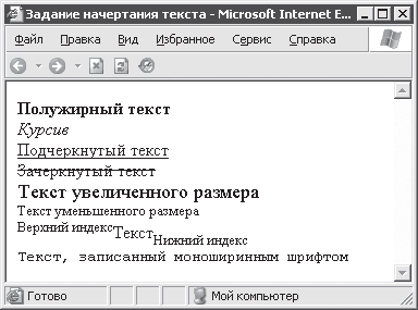 Для наглядности можно рассмотреть пример HTML-документа, в котором используются различные элементы задания начертания текста (пример 3.2).