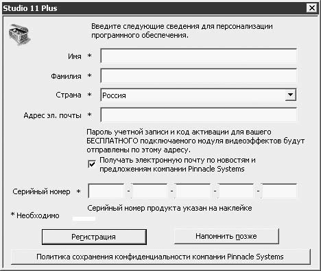 После выбора языка собственно и начинается установка. С самого начала будет предложено произвести регистрацию программы. Для ее осуще ствления необходимо ввести некоторые данные в поля окна, показанного на рис. 1.2. Серийный номер Pinnacle Studio – необходимая составляющая этих данных – должен быть указан на диске или в документах, прилагающихся к компакт-диску.
