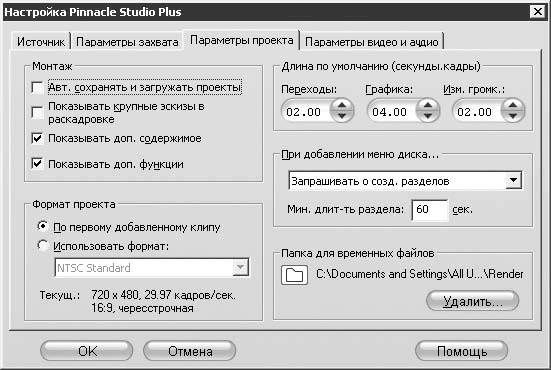 По умолчанию формат проекта определяется по формату первого добавленного в проект фрагмента видео. Часто это является наилучшим вариантом. Но можно также вручную указать формат проекта. Для этого воспользуемся окном Настройка Pinnacle Studio Plus (рис. 1.9). К нему мы будем обращаться еще много раз. Параметры проектов, в том числе и формат, устанавливаются на вкладке Параметры проекта. Открыть окно параметров сразу на показанной на рисунке вкладке можно с помощью команды меню Настройки → Параметры проекта.