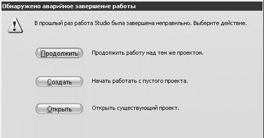 Особо стоит отметить ситуацию, когда работа программы Pinnacle Studio завершается неправильно (ошибка самой программы, аварийное завершение работы операционной системы и т. д.). В последнем случае Studio при последующем запуске предложит возобновить работу с проектом (ведь файлы проекта с самыми последними изменениями на диске остались). Окно, открывающееся в этой ситуации, приводится на рис. 1.11.