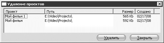 Когда длительность фильма, редактируемого в Pinnacle Studio, велика (полчаса, час и более), файлы проекта могут занимать на диске очень много места. Когда часть проектов становится ненужной (фильм создан, DVD или видеокассеты записаны), их можно удалить. Для удаления проектов в Studio предусмотрена отдельная команда меню Файл → Удалить проекты, при выборе которой открывается окно, показанное на рис. 1.14.