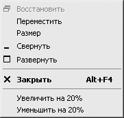 Обратите внимание на меню, раскрывающееся при щелчке кнопкой мыши на значке окна. В этом системном меню обычно присутствуют пункты, выполняющие стандартные действия над окном, такие как закрытие, минимизация, максимизация и др. Для доступа к этому меню предусмотрены специальные функции, что дает возможность использовать его в своих целях.