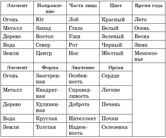 Древние китайцы, народ проницательный и обладавший богатым воображением, составили длинный перечень соответствий между пятью элементами, объектами природы и социальными феноменами. В него (помимо многого прочего) включены вкусовые качества, запахи, музыкальные ноты, времена года, цвета, человеческие органы и этические ценности. В таблице № 1 перечислены некоторые из указанных соответствий.