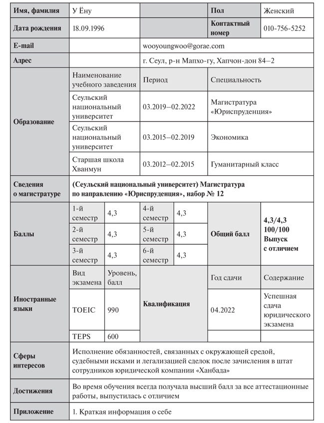 Резюме, отправленное У Ёну в юридическую компанию «Ханбада»