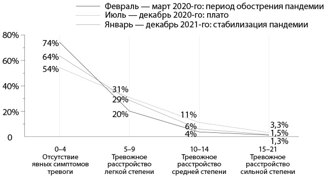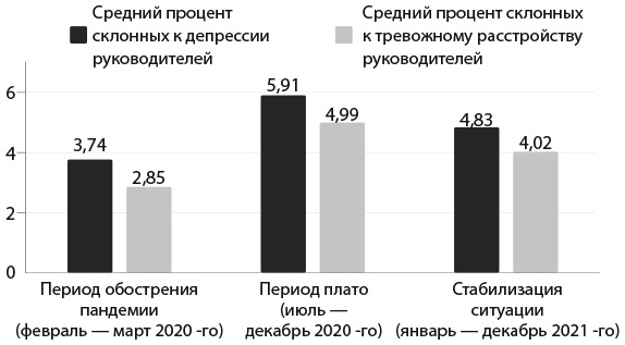 Примечание. Нужно отметить, что данные отражают только поведенческую склонность к депрессии и тревожному расстройству, а не реально подтвержденные диагнозы. Респонденты для трех временных промежутков выбраны методом случайной выборки из числа руководителей разных компаний и предприятий.