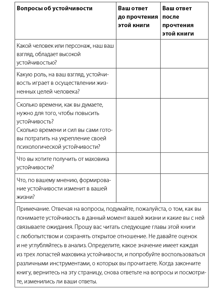 Маховик устойчивости можно представить в виде системы драйверов развития, движущих нас вперед на протяжении всей нашей жизни. Мы проанализировали классические теории и отобрали самые новые труды по теме, дополнили их результатами наших собственных исследований, и так нам удалось создать систему, которая позволяет изменить восприятие и поведение. Модель «маховик устойчивости» – это результат многолетних исследований, отшлифованный и усовершенствованный в процессе создания учебных курсов. Это не твердое руководство, а динамичная система, в которую входят теория и набор инструментов. Вместе они помогут вам выбрать и сформировать ваш собственный маховик устойчивости, подходящий именно вам, соответствующий вашему жизненному курсу и темпу. На мой взгляд, формирование устойчивости похоже на занятия спортом: и там и там нужно долгосрочное системное планирование, необходимо следить за своим состоянием, регулярно делать упражнения, подстраиваться под обстоятельства и никогда не бросать начатое. Конечно, в процессе нас ждет множество непредвиденных случаев и препятствий, которые помешают осуществлению планов. Когда происходит что-то неприятное, все, что нам остается, – это помнить, что «изменчивость есть постоянство». Будьте спокойными и открытыми, подходите к изменениям с научным подходом, узнавайте себя и идите к цели, совершая одну за другой маленькую победу, – так в конце концов вы обеспечите здоровье своей психики и будете полны энергии. Запустите свой маховик устойчивости. Развитие устойчивости – систематический процесс, и даже самое маленькое изменение в восприятии, воспитание в себе правильной привычки позволит вам накопить энергию и станет шагом на пути к лучшему себе.