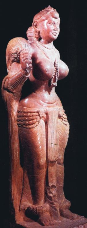 Это вертикальная статуя, запечатлевшая фрагмент танца Якши. Поверхность не отполирована, поэтому значительно выветрилась, поза передаёт силу и мощь, она полна героического духа фехтовальщика. Этот вид танца Якши в стиле Вуфу похож на прототип самых ранних статуй Будды в Матхуре. Статуя Якшини, созданная в период династии Маурьев, также представляет собой архаичный стиль, а преувеличенная форма и богатый декор – уникальные характеристики индийского искусства. Статуя Якшини, как правило, обнажена, с круглой, высокой, выпуклой грудью, необычно пухлыми ягодицами, прозрачной марлевой юбкой на талии и различными украшениями по всему телу.