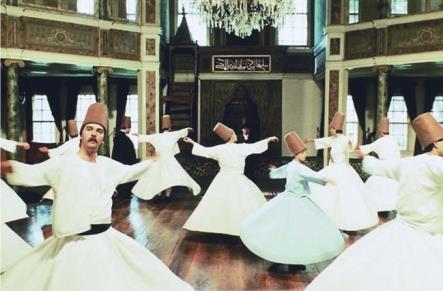 Во многих местах Турции очень распространён мистический танец-вращение. Такой танец возник в Конье, старой столице Османской империи, в Центральной Турции, также он известен как «коньянский танец-вращение». Это коллективный танец, в котором участвует около десяти человек. Танцоры в основном мужчины. Все одетые в чёрное, они выходят на сцену и занимают свои места. Как зазвучит музыка, танцоры снимают свою чёрную одежду и остаются в белом платье с чёрным поясом и высокой шляпе цвета хаки. Когда танец начинается, танцор вытягивает руки: ладонь его правой руки обращена к небу, ладонь левой руки обращена к земле, так он вращается без остановки на левой ноге. Танцор может вращаться на месте в течение десяти минут, не меняя выражения лица.