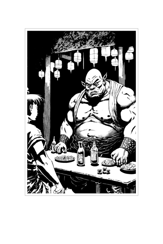 Выглядел он так странно, что Такуан сперва и за человека его не принял. Внушительного роста незнакомец сидел на толстой скамье, которая прогибалась под его весом. Ноги его походили на снопы соломы, а руки показались Такуану толще ветвей столетнего дуба. Но ещё больше был у незнакомца живот. Такой большой, словно он пивной бочонок целиком проглотил. Венчала всё это абсолютно лысая голова с торчащими в разные стороны ушами. На лице красовался нос, напоминающий свиной пятак.