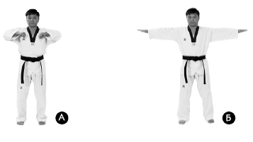 Примите исходное положение – туловище естественно выпрямлено, ноги на ширине плеч, руки выпрямлены в стороны, голову держать прямо.