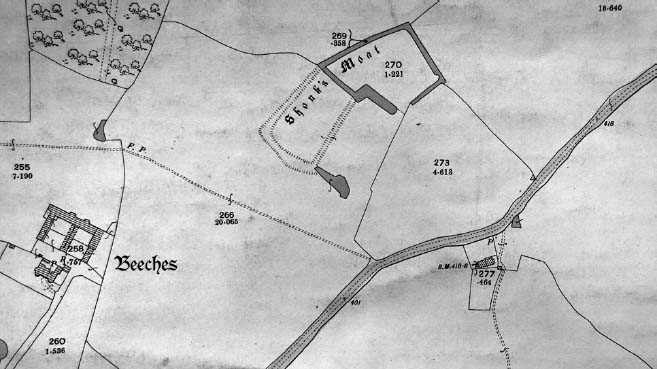 The earliest large-scale Ordnance Survey map has it as Shonk’s Moat (in the gothic typeface reserved for antiquities) and clearly shows a double moat arrangement forming two islands. By 1905, when the archaeological society visited, a fishpond remained, and the arms of the moat were mostly dry. The only clues that there had once been a building were the traces of foundations, which still dimpled the turf.