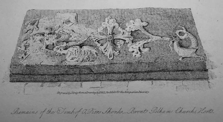 Following page 450 of volume ten are six extra folio leaves. Pasted neatly in is an engraving of Shonks’ tomb, appropriated from some poor adulterated copy of the 1816 Antiquarian Itinerary. The picture is the Itinerary’s most important contribution to the history of the legend since the text was unoriginal. Drawn by the thirty-year-old Frederick Stockdale, an antiquary more often associated with the West Country, it is captioned ‘Remains of the Tomb of O Piers Shonks, Brent Pelham Church, Herts’. The composition is a little cramped, but mostly accurate, and captures the relief of the carvings although Stockdale chose to frame them in a rectangle, ignoring the shape of the coffin lid, and so the essential tombness is lost.