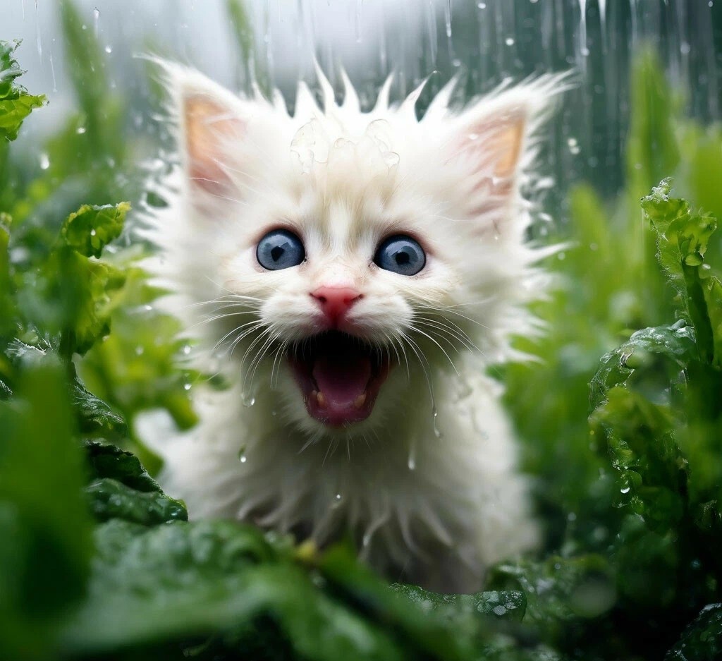 Дождь лил всё сильнее, вдобавок ещё и с кустов ручьями стекала вода. Катя сразу промокла до нитки, но не отступала. Она с упорством продолжала пробираться сквозь густые заросли. Вдруг ее взору предстала такая картина – в пучках высохшей травы, прижавшись к стволу дерева, сидел маленький, мокрый, серый комочек. Он сидел, крепко зажмурив глазки, и громко мяукал, при этом он, очень широко открывая свой маленький ротик. Наверное, ему было очень страшно и холодно.