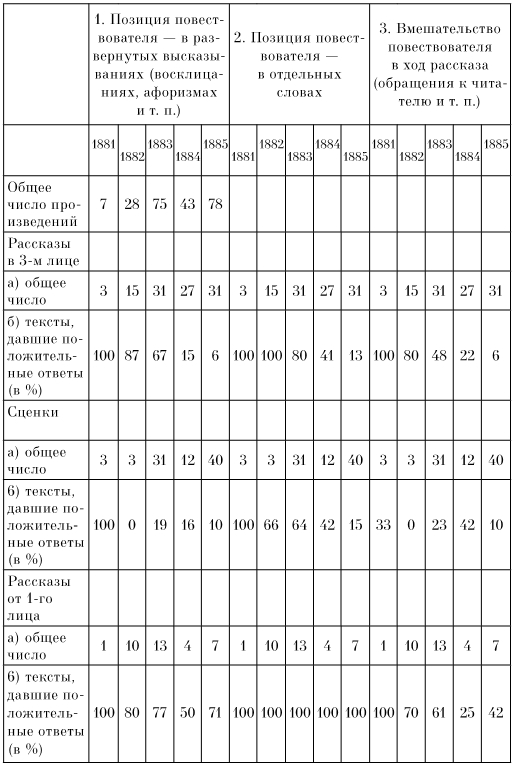 Резко сократилось во всех жанрах число выступлений повествователя с рассуждениями и высказываниями эмоционального порядка (первый пункт таблицы) – с 67–19—77 % в 1883 году до 15–16—50 % в 1884 году.