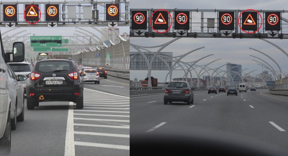 Знак 1.32 как правило располагается на электронных табло (кольцевая автомобильная дорога (КАД), западный скоростной диаметр (ЗСД) и служит для предупреждения, что необходимо по возможности найти другой путь объезда, либо быть готовым к тому, что впереди по ходу движения будет «затор», планируйте свое время с учетом данной дорожной обстановки. Как на рис. 16.