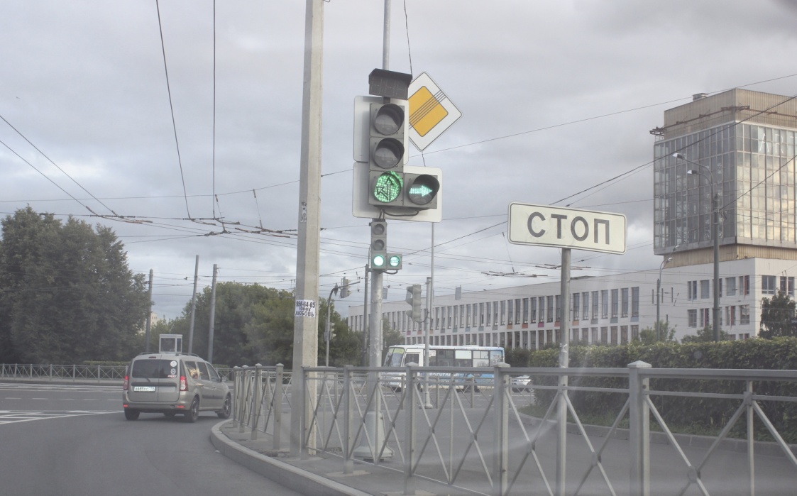 Рис. 22 показывает применение знака 2.2, но действует он только тогда, когда светофор находится в реверсивном режиме (моргает постоянно желтым светом), либо выключен, а сейчас необходимо двигаться по сигналам светофора