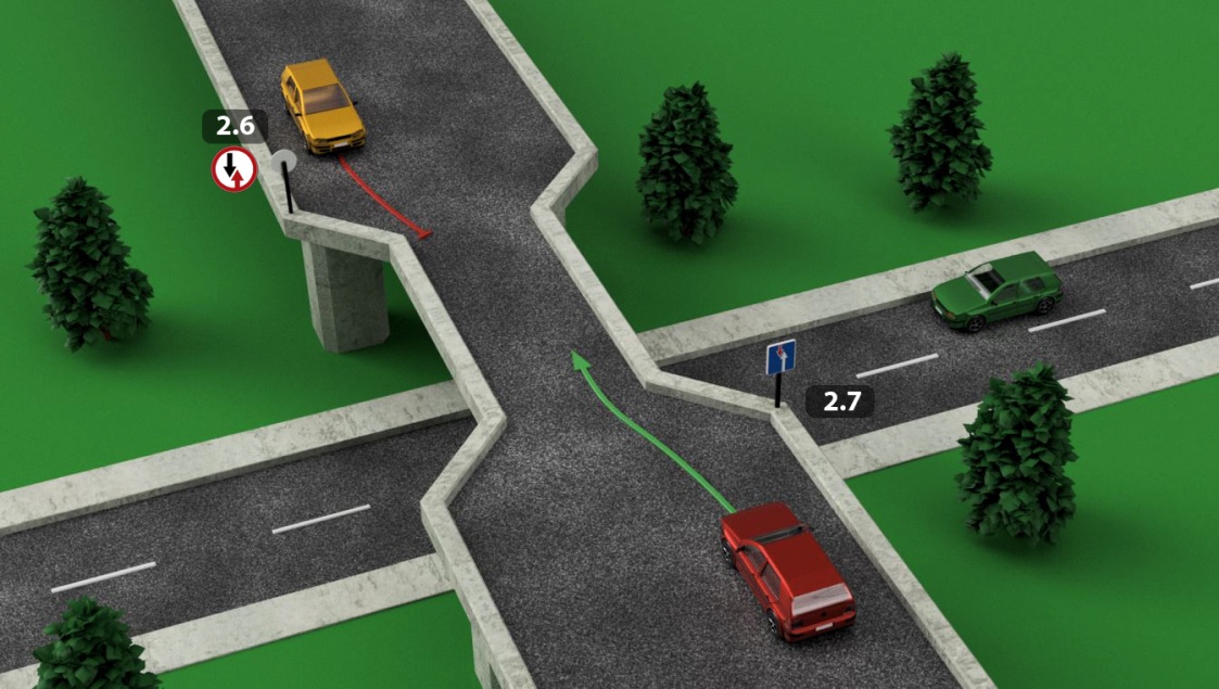 Справа, по примыкающей дороге движется автомобиль, сзади Вас движется другой автомобиль. (Он только, что видел знак 2.3.2 («Примыкание второстепенной дороги справа») и у него не возникает вопроса о преимуществе в движении). Скорость не снижает, так как ожидает от Вас движение вперед. Ваши действия? Перекресток, который Вы проезжаете за сегодняшний день уже 100. Поворот головы вправо, рисунок 23 (2,6), позволит заметить наличие знака 2.4 «Уступить дорогу», на второстепенной дороге. Это позволяет Вам оперативно (доли секунды) сориентироваться, и принять правильное решение, лишний раз убедится, что Вы находитесь на главной дороге и продолжить движение с уверенностью в своем преимуществе. Безусловно, в ПДД, согласно п.п. 10.1., от водителя транспортного средства требуется двигаться со скоростью, которая будет обеспечивать безопасность дорожного движения. Снизить скорость, и убедится в том, что вы имеете право первоочередного проезда или все же данное право, предоставлено машине, которая справа от вас (помеха справа). При скорости максимально разрешенной для движения в населенных пунктах 60 км/ч, а при такой скорости автомобиль преодолевает расстояние за 2 секунды в 34 метра и на принятия решения, время практически нет. Неприятный момент в такой ситуации заключается вот еще в чем: машина, которая движется сзади, ждет от Вас конкретных действий (что вы будете двигаться, так как у Вас преимущество). Остановка для пропуска транспортного средства, которое не имеет преимущества в движении для водителя автомобиля сзади будет неожиданным и такая ошибка скорее всего приведет к столкновению с Вами. Водитель автомобиля сзади ожидал, что Вы будите двигаться и не предпологал, что вы можете остановиться, когда вы находитесь на главной дороге.