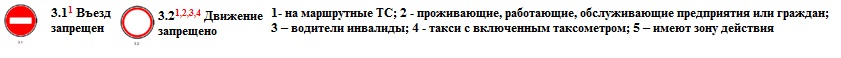 Индекс, указанный над номером знака указывает на какое транспортное средство- этот знак не распространяет свое действие. Например: (3.11): 1- на маршрутные ТС; (3.21,2,3,4) 2 – проживающие, работающие, обслуживающие предприятия или граждан расположенные за знаком; 3 – водители инвалиды; 4 – такси с включенным таксометром; 5 – имеют протяженность зоны действия.