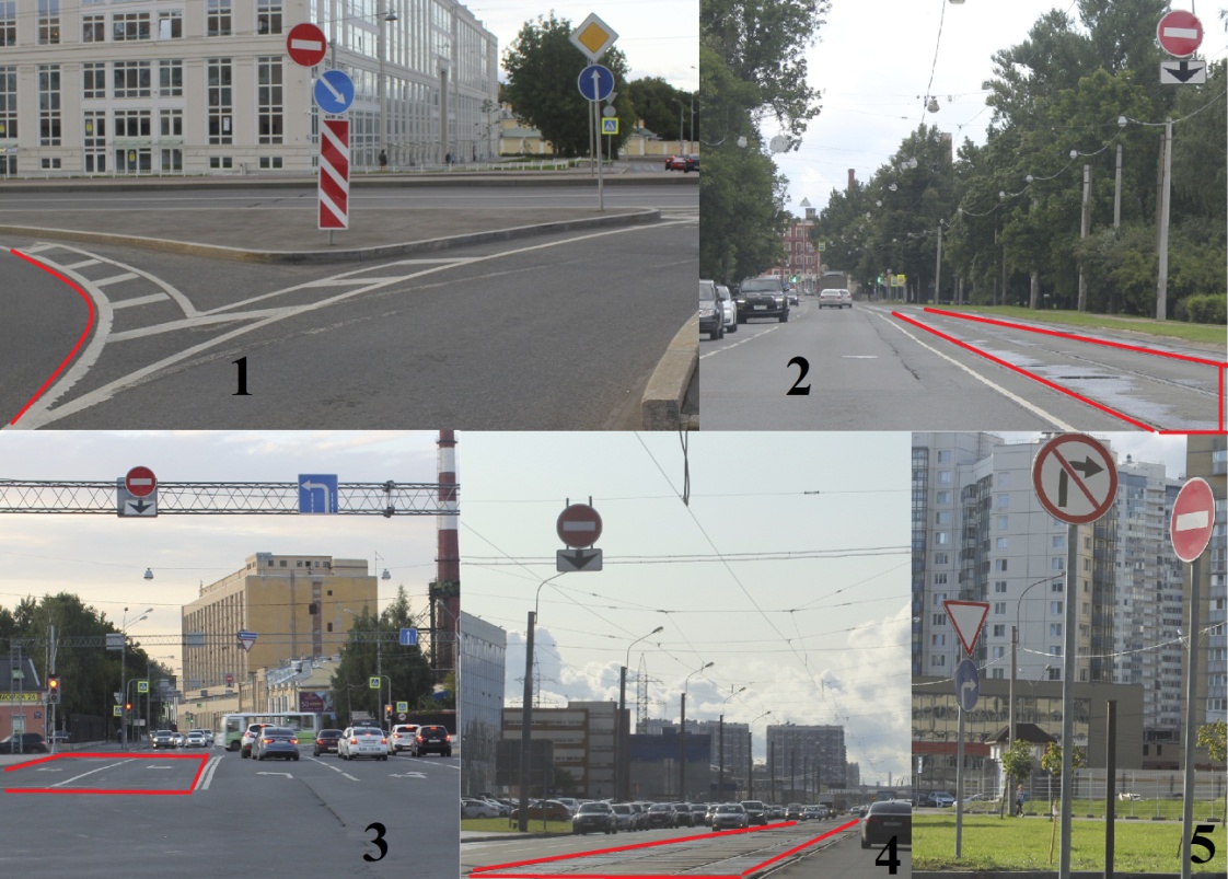 Знак 3.1 «Въезд запрещен» активно устанавливают на перекрестках с несколькими возможными направлениями для движения, например, на рис. 25(1) показано встречное направление и направление объезда. На рис. 25 (2, 3 и 4) представлена выделенная полоса для маршрутных ТС, а рис. 25 (5) запрещает поворот направо, там выезд с дороги, которая имеет одностороннее движение.