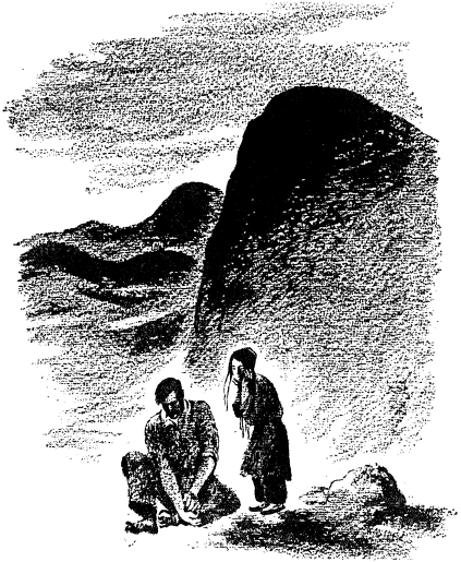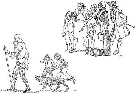 У него была собака по имени Волк. И вот однажды, чтобы избавиться от работы на ферме, Рип взял ружье и отправился вместе с Волком бродить по лесам. Забрался далеко. И вдруг слышит окрик: «Рип ван Винкль! Рип ван Винкль!» А его Волк тут же «ощетинился, зарычал, прижался к хозяину и замер…» И вот Рип видит странного незнакомца «с густою гривою волос и седой бородой. Одет он был по старинной голландской моде: в суконный камзол, перетянутый у пояса ремнем, и несколько пар штанов, причем верхние, необыкновенно широкие, были украшены сбоку и рядами пуговиц, а у колен – бантами. Он тащил на плече изрядный бочонок, очевидно наполненный водкой, и подавал Рипу знаки, прося его приблизиться и помочь».