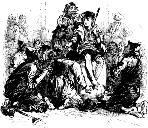 Он видит в окно дворца «толпу мужчин, женщин и детей беднейшего сословия, которые со свистом и гиканьем бежали по дороге». По его желанию узнают и сообщают, что эта толпа следует за мужчиной, женщиной и девочкой, которых ведут на казнь. «Смерть, лютая смерть ожидает троих несчастных! В сердце Тома словно что-то оборвалось. Жалость овладела им и вытеснила все прочие чувства; он не подумал о нарушениях закона, об ущербе и муках, которые эти преступники причинили своим жертвам, он не мог думать ни о чем, кроме виселицы… От волнения он даже забыл на минуту, что он не настоящий король, а поддельный, и прежде чем он успел подумать, у него вырвалось из уст приказание: