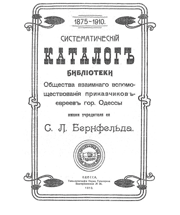 «Еврейского литературного общества» открывает отделение сего общества в г. Одессе. (Подтверждено канцелярией градоначальника Одессы 25 ноября 1909г. за №67188). При сем прилагается устав общества, цель которого – «Содействие изучению и развитию научной и изящной еврейской литературы на древнееврейском и разговорном еврейском языке».