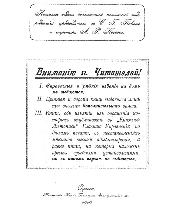 «Выход в свет настоящего каталога совпал по времени с весьма знаменательным моментом в жизни нашего общества и, в частности, библиотеки. 1-го июня 1910 года исполнилось 35 лет со дня