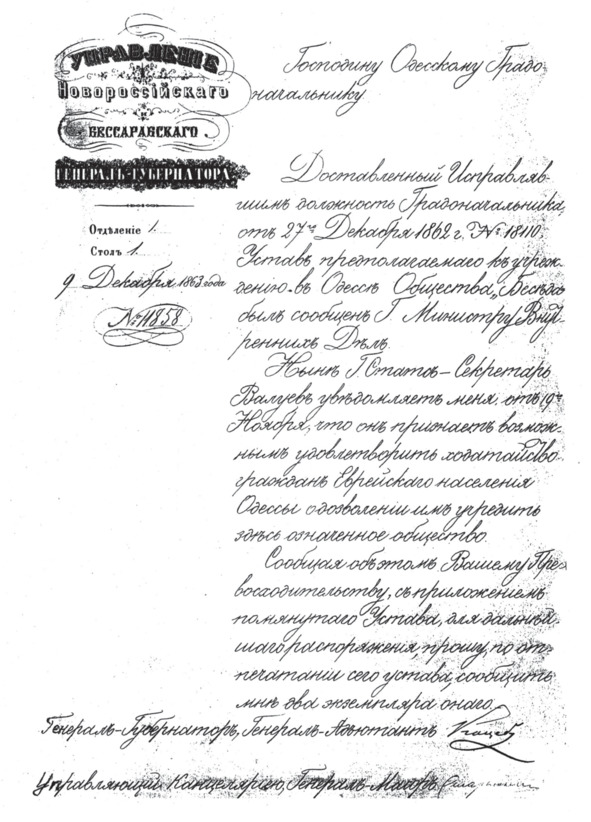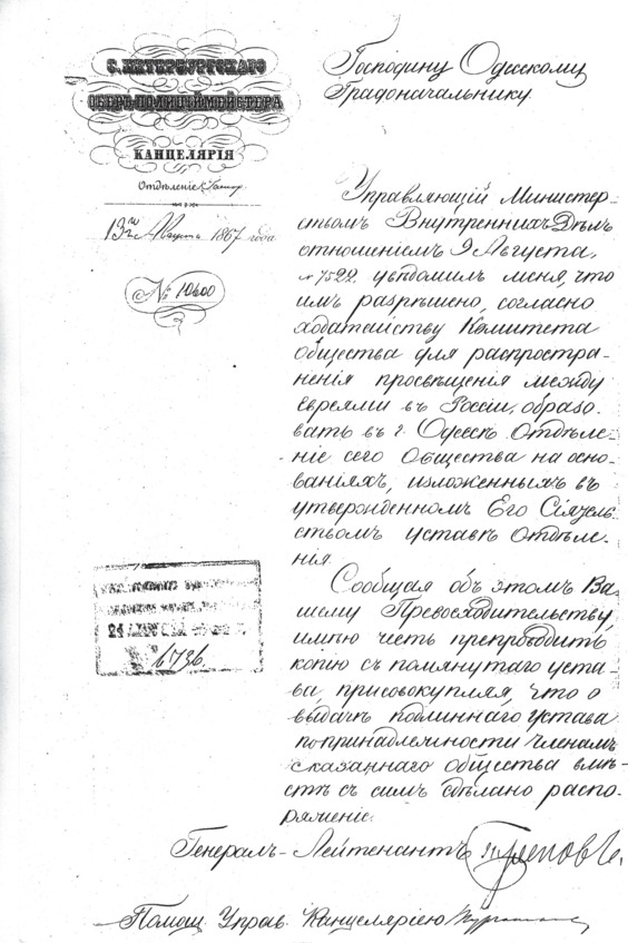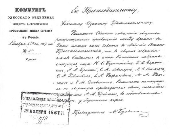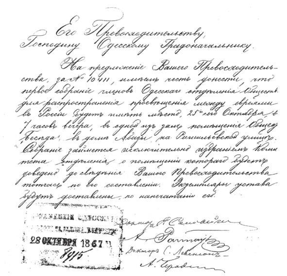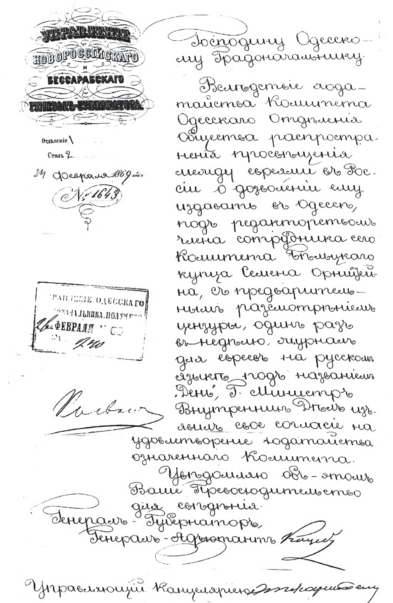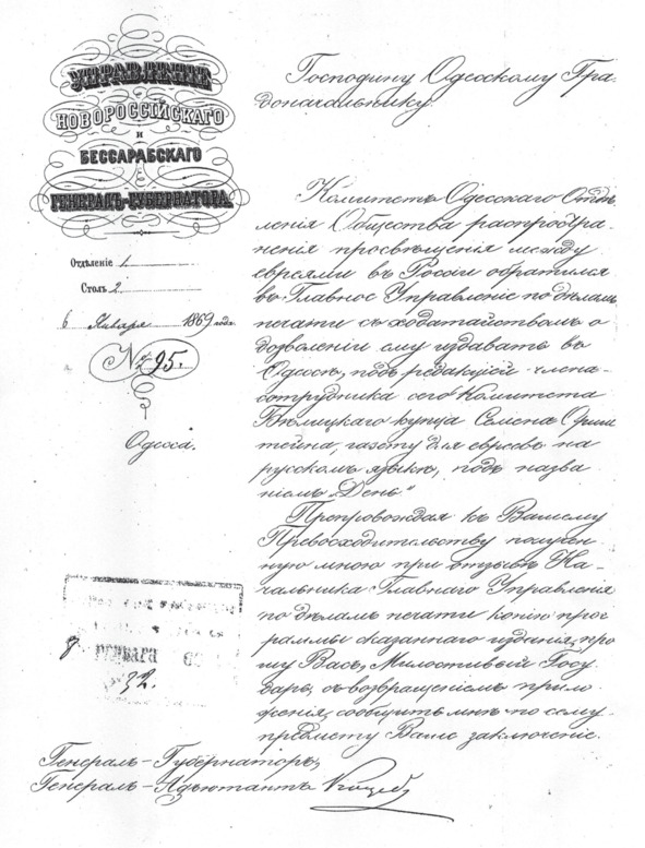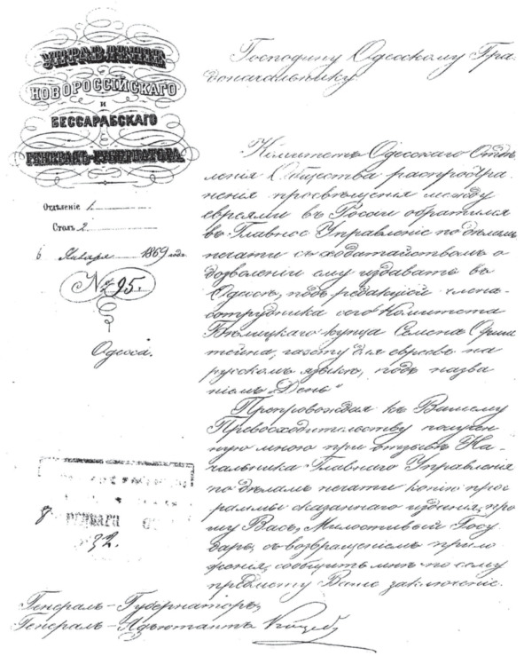 – и 16 сентября 1863 года свидетельство 011066 на право содержания печатного заведения было получено. Разрешение на таковую выдавалось при условии, «чтобы в еврейской типографии не было никаких других шрифтов, кроме еврейского». Такая мера была принята в связи с тем, что с «означенных типографий взималась плата на содержание еврейских училищ». Если бы типограф печатал что- либо не на еврейском языке, он мог бы уклоняться от сбора в пользу еврейских училищ. Дабы не давать владельцу печатного заведения такой возможности, законодатель предусмотрел запрет использования шрифтов других языков.