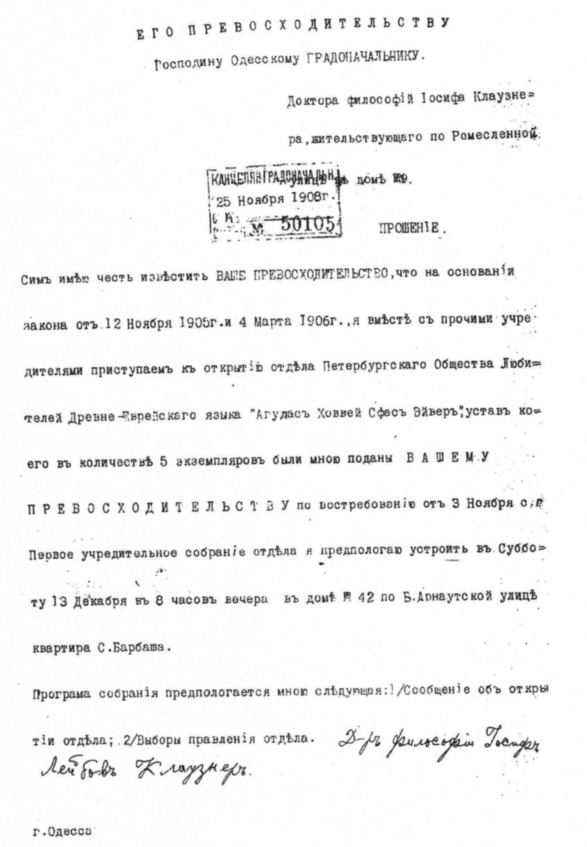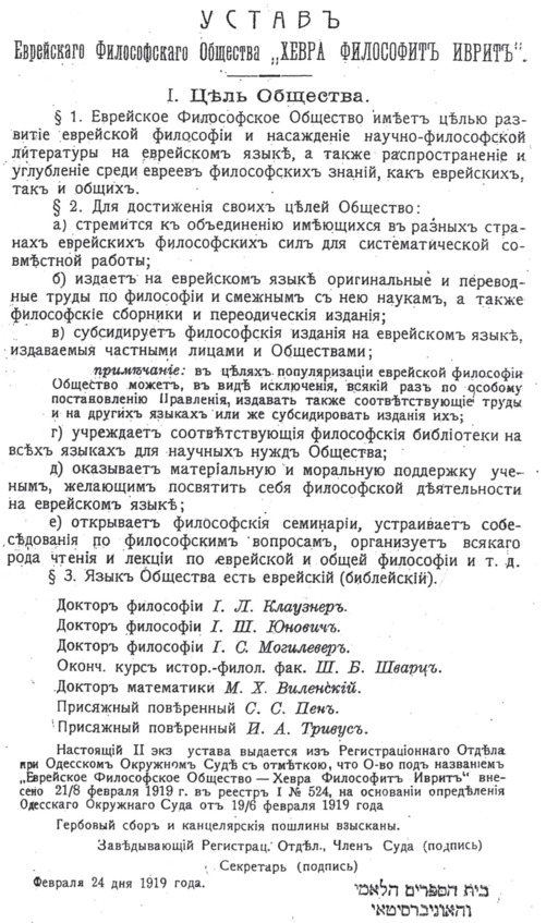 В 1919 году, в Одессе появилось «Еврейское философское общество» («Хевра философит иврит»). Его целью являлось развитие еврейской философии и распространение ее среди евреев.