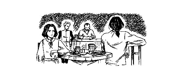 Оставив вещи в комнате, спустились вниз, в большой зал. Сели недалеко от стойки, на свету. Слуга спросил грубовато: «Что жрать будете? Есть индейка, есть мясо по-римонски, есть овощи…»