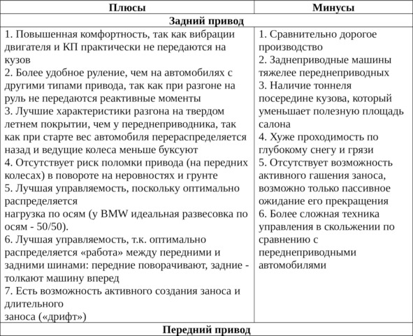 – автомобили, которые движутся за счет вращения задних колес (т.е. крутящий момент от двигателя передается только на задние колеса). Задние колеса таких машин являются ведущими и толкают перед собой автомобиль. Передние колеса в этом случае нужны для опоры, изменения направления движения и снижения скорости (т.к. тормоза легкового автомобиля установлены на всех четырех колесах). Заднеприводные автомобили