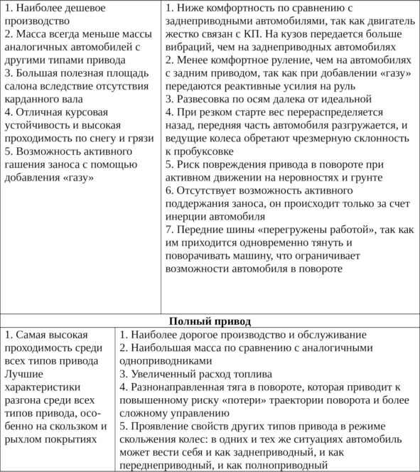 В таблице показаны свойства автомобилей с различными типами приводов.