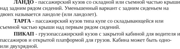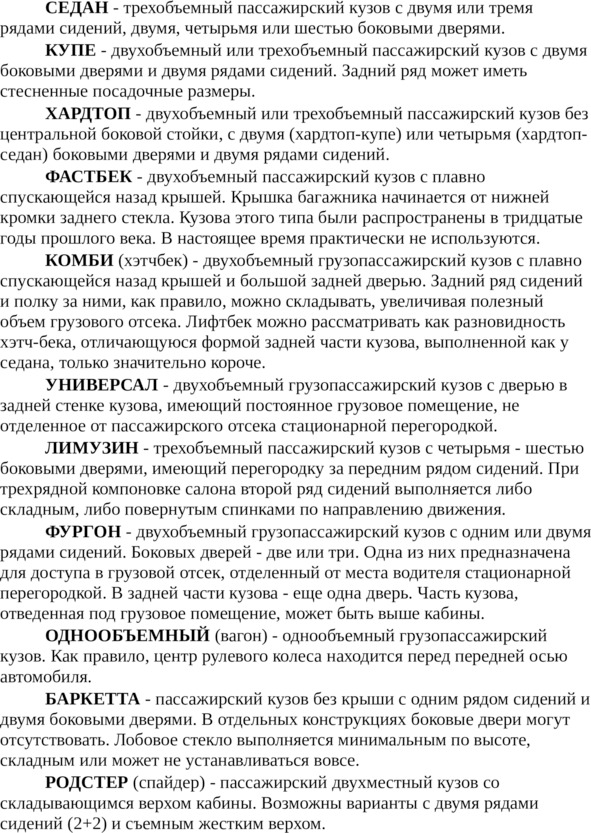 – по типу кузова (седан, хетчбэк, универсал, купе, вагон, джип, пикап, кабриолет, лимузин);