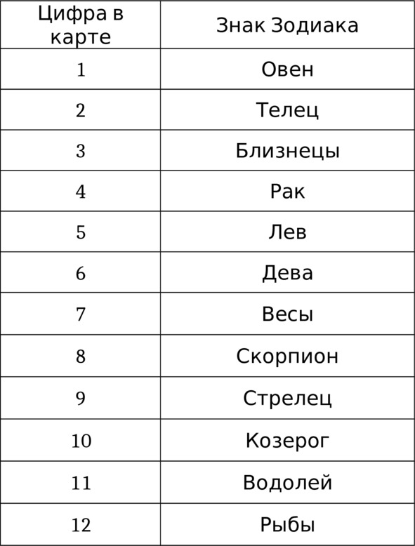 В этой программе все понятно, но как без строки и надписи понять какой у человека знак зодиака? В этом нам поможет таблица. Каждый знак зодиака пронумерован и в карте вы увидите цифру в каждом отделении. Это и есть знак зодиака. Но их же там 12, какой основной? – Спросите вы.