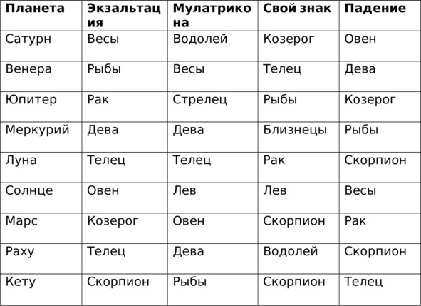 Чтобы определить расположение планеты нам понадобится натальная карта и таблица №1. В натальной карте смотрим какой знак зодиака стоит в доме с планетой. Допустим, если в любом доме стоит Сатурн и знак зодиака этого дома Козерог, то это значит, что Сатурн находится в своем знаке. Если знака, в котором расположена планета, нет в таблице – это значит планета находится в нейтральном положении.