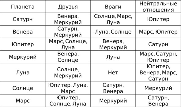 В таблице №2 представлены взаимоотношения между основными планетами.