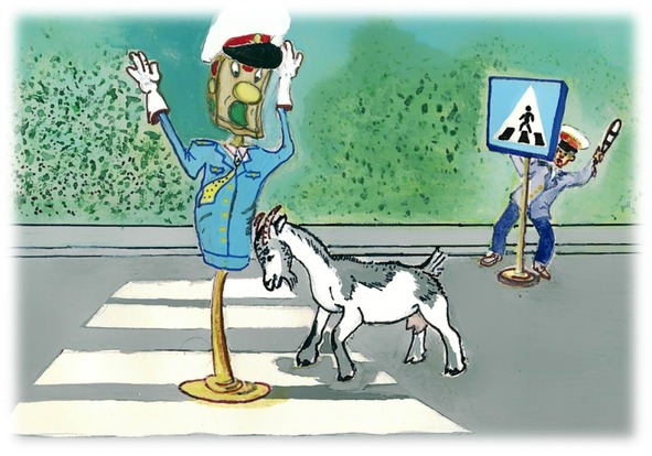Милиционеру рожками не шуточно грозя…– Ты чего? Что тебе?..Отступал постовой…А коза грозила: Бе – бе —е!..Мотая головой…И с прискоком – боком, боком…,Боднула… светофор…– Меня не бодали до сих пор,Если честно-Здесь козе играть не место!..А коза на это: ме – е.– Ничего не понимаю!..Постовой недоумевает– Чья коза нас донимает?Образовался автомобильный затор!..Завопил Светофор: Какой позор!!!Мимо мальчик на коляске инвалидной проезжал,И козу-дерезу случайно увидал:– Просто эта козочка,Напугана немножечко.Ты бородкой не тряси,На меня не косись.Всё равно не боюсьИ с тобой не подерусь.