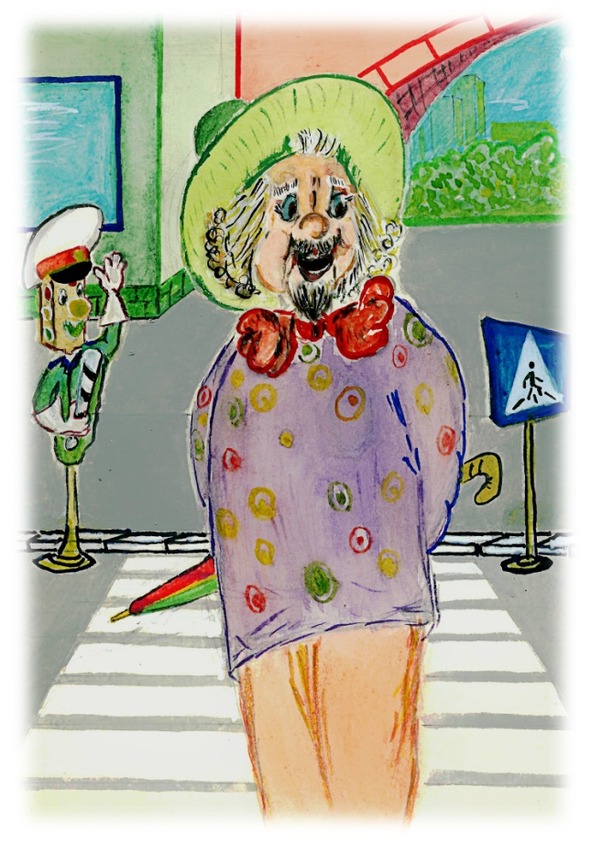 Коза удивилась,На Кирилла покосилась,Хотела боднуть…Да передумала.И подчинилась. Коза – то была умная!Постовой спросил:– Как зовут тебя?– Кирилл, но коза не моя,Я не знаю она чья…Народ вокруг подсобрался,Советовать старался:– Небось, сбежала со двора.– Да уж… Рогатая шустра…Но, никто подойти не решался,На всякий случай остерегался.А то мало ли что?! (может у козы нрав крутой?!)Кирилл не побоялся,Ободрить козу постарался:– Нам бы ошейник и повадок…Кто-то предложил: Вот верёвки кусок.Кирилл поблагодарил,На рожки верёвку козе нацепил:– В «бюро находок» отведу,Может, хозяина найду…И покатил наш Кирилл,Рядом коза цокала-семенила…Мальчик козе говорил:– Нельзя без хозяина по городу ходить,В неприятность дорожную можно угодить.Видишь, мне не повезло.Ладно, так хоть обошлось…А могло быть куда хуже!..Ты, коза, меня послушай,Я был тоже не послушный.Играл где не нужно,Вот и пострадал…– Это ты, Кирюша, правильно сказал.Кирилл удивился и тут же остановился.– А кто это… говорит?Видит Кирилл дедушка стоит,С зонтиком в руке,В разноцветном колпаке,В ярких яблоках пиджак,
