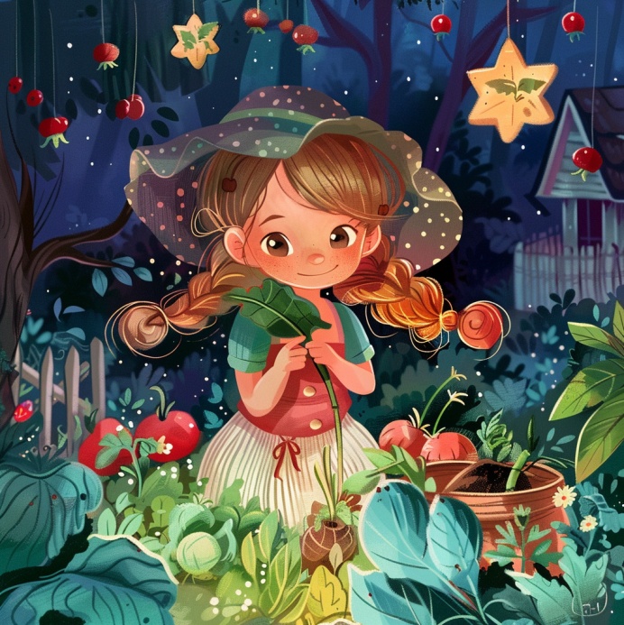 Однажды, прогуливаясь по лесу, Софи нашла тайный сад, полный необычных разноцветных овощей, которые светились под лучами солнца. В саду жил добрый Садовник, который сказал: "Софи, эти овощи – особенные. Они могут быть такими же вкусными, как твои любимые сладости, и при этом дадут тебе силы и здоровье."