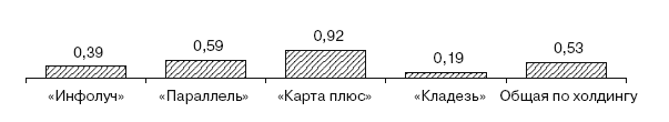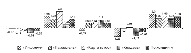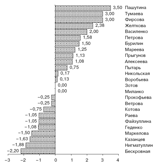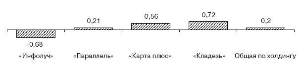 Средняя оценка каждого корреспондента представляет собой среднюю оценку за все его репортажи, вышедшие в эфир в анализируемых выпусках новостей. Очевидно, что данный подход довольно селективен, поскольку анализировалось вещание всего за неделю и всего лишь несколько выпусков новостей. Тем не менее такой метод дает выборочную картину по качеству информационного вещания в медиахолдинге (рис. 1.26).