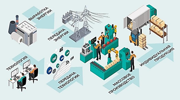 Возможность передавать на расстояние и в больших объемах не только энергию, но и технологию (рис. 4), другую производственную информацию обусловливает синергический эффект, что позволяет резко увеличить производительность труда и обеспечить массовое производство продукции по индивидуальным заказам.
