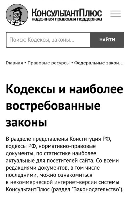 В этой связи необходимо пользоваться текстами нормативно-правовых актов, размещенными либо на «Официальном Интернет-портале правовой информации» (www.pravo.gov.ru) (см. ил. 1), либо на официальном сайте популярной справочно-правовой системы «КонсультантПлюс» (в некоммерческой бесплатной версии) (см. ил. 2), для пользования которыми не требуются профессиональные навыки.