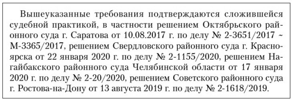 Ни в коем случае не заявляйте ходатайство о приобщении судебной практики к материалам дела: судьи в этом случае отказывают со ссылкой на то, что в России нет прецедентного права[3]. Судебную практику просто нужно указывать в качестве приложения к подготовленному вами процессуальному документу, который вы заявили к приобщению к делу (иск, письменные объяснения, ходатайство и т. п.).