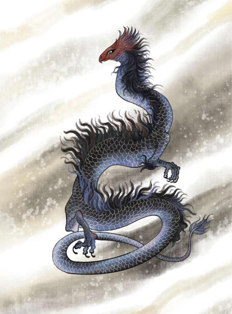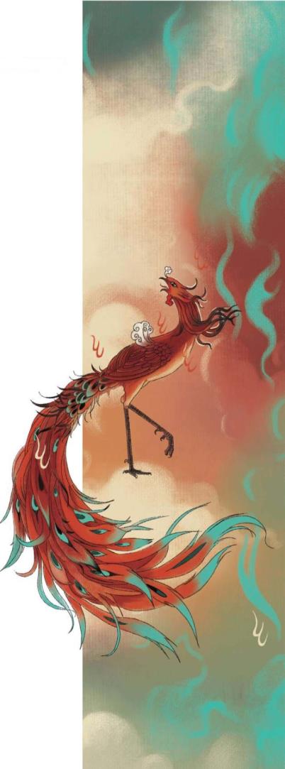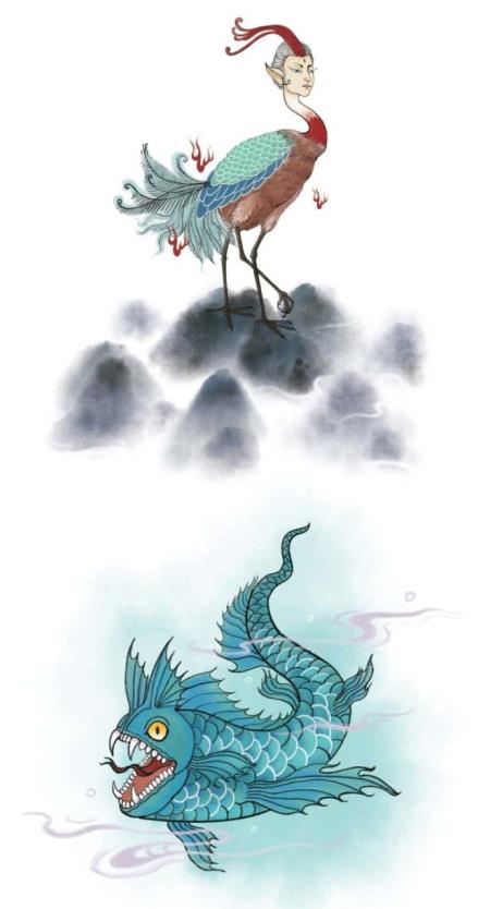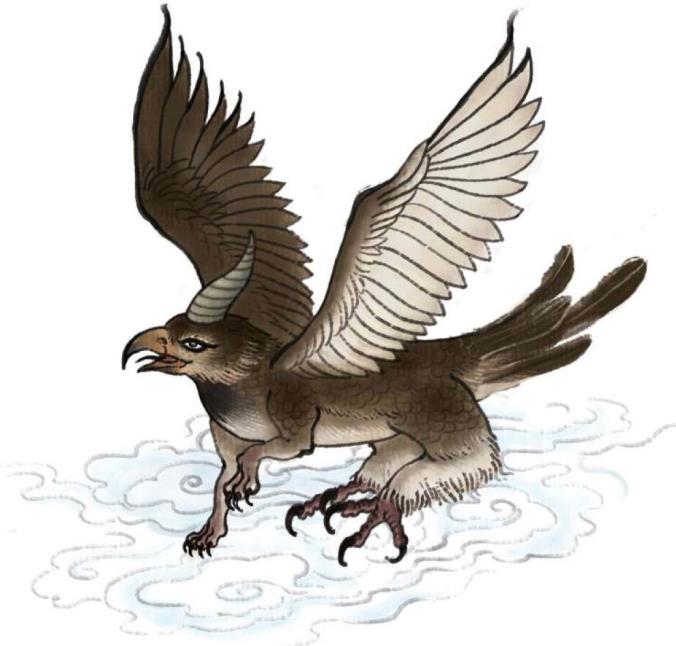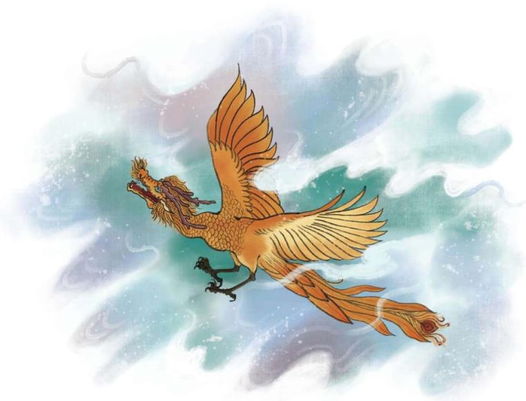 В пятистах ли к востоку от горы Даого стоит гора Даньсюэ. На горе много золота и нефрита. Там берёт своё начало река Даньшуй (1), которая на юге впадает в Бохай (2). Там живёт птица феникс, внешне она похожа на курицу, у неё разноцветное оперение. Узор на её голове складывается в иероглиф «добродетель», а узор на крыльях – в «справедливость», узор на спинке говорит о «вежливости», на груди – о «человечности», а на брюшке – о «вере». Эти птицы радостно пьют, едят, поют и танцуют. Где эта птица появляется, там воцаряются мир и покой.