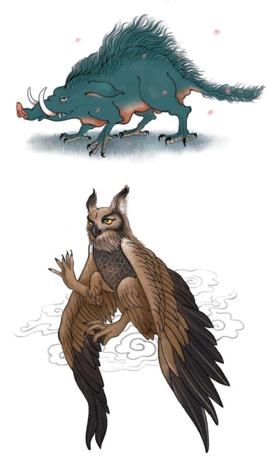 В трёхстах ли к востоку от горы Чанъю стоит гора Яогуан. На южной стороне горы много нефрита, а на северной стороне – золота. Там живёт зверь Хуахуай, видом своим он похож на человека, но у него длинная грива, как у вепря, живёт он в пещерах и зимой впадает в спячку. Крик его похож на звук ударов топора по дереву. Как только он появится где-нибудь, так в этом месте тут же на людей накладывают тяжёлую трудовую повинность (1).